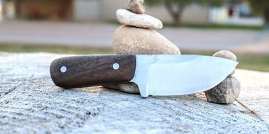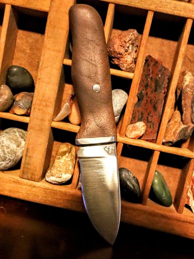 This drop point has a hidden tang handle wrapped with lovely black walnut that is sculpted to fit perfectly in the hand. It has a 3", 1095 steel blade and a length of 7.5"
