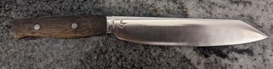 This was my first kitchen knife designed for a friend, based off a Viking Seax. It's made of high carbon 1095 steel which keeps a good edge and gains character over time. The blade is 6.5" and the over all length is 11"